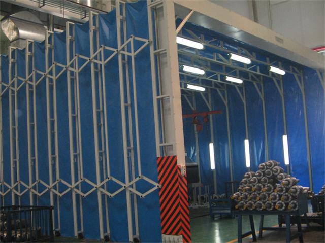 伸縮噴漆房通常采用多組可移動的框架有成平行四邊形狀的連桿連接而成,再點(diǎn)擊的驅(qū)動下帶動整個前室伸縮移動,框架之間由阻燃PVC布密封,行程一個隔離的獨(dú)立工作間,避免噴漆工作的車間環(huán)境污染。