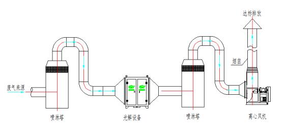 制藥廢氣處理考慮運營成本及安全性,本方案工藝路線擬定采用“通風系統(tǒng)(風機、收集罩、管道)+預(yù)處理系統(tǒng)(水洗塔)+核心凈化系統(tǒng)(UV光解凈化設(shè)備)+后處理系統(tǒng)(堿淋塔)”來進行制藥廢氣處理。工藝設(shè)備圖如下:
